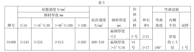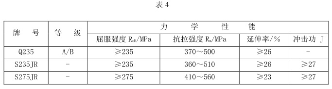 出口歐盟的扁鋼的力學性能應符合表4中S235/S275的要求。內銷的扁鋼的力學性能應符合表4中Q235的要求;出口日本的扁鋼的力學性能應符合表5的規定: