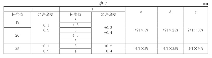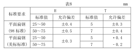 I齒型扁鋼,齒高應不小于1.0mm。平面扁鋼的截面尺寸及允許偏差應符合表7(07標準)表8(98標準、美標標準)的要求。平面齒型扁鋼,每100mm內的齒應保持在6.9個~7.4個,齒型的尺寸及允許偏差應符合表8的要求。