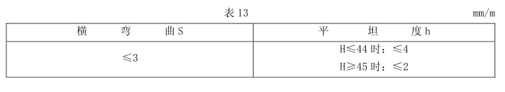 扁鋼的橫彎曲和平坦度應符合表13的要求。扁鋼的扭曲應在0.5mm/m以下。扁鋼的總彎曲度不應超過7mm/6m。每500mm長的扁鋼中不應出現兩個彎曲,且不得出現死彎。