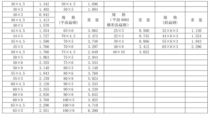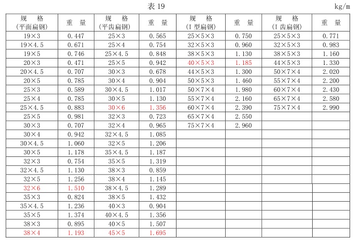 扁鋼的理論重量應符合表19的要求(計算扁鋼的理論重量時,鋼的密度為7.85g/cm2),其中齒型扁鋼的重量為同規格平面扁鋼重量的0.96倍。JIS產品質量允許差以JISG 3194:1998為依據