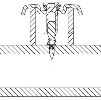 1)、將定位墊圈套在射釘上,然后將射釘裝入射釘器的釘管內,確保射釘器內裝有射釘彈,并根據承載件厚度調節好射釘器威力大小;現有射釘器很多已經具有威力調節器,可以按1、2、3三個檔位,根據承載件的鋼板厚度調節威力。或者在鋼板厚度單一的場合,也可以選用威力合適的威力固定的射釘器進行操作。