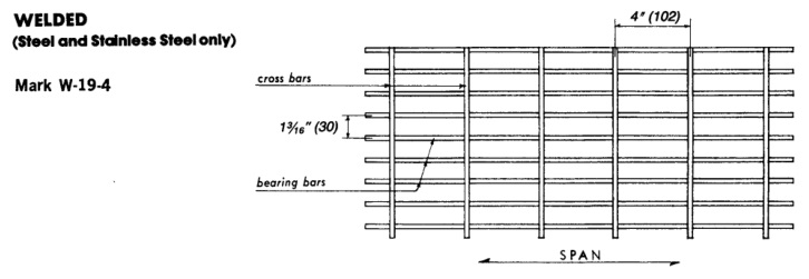 承載扁鋼間距由一個表示十六分之一英寸的數字表示。對于焊接鋼格板或壓鎖定鋼格板,這就是扁鋼中心到扁鋼中心的距離,以十六分之一英寸為單位。