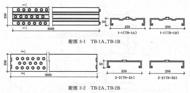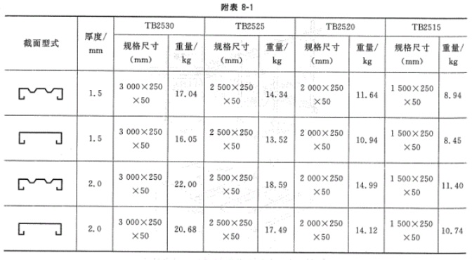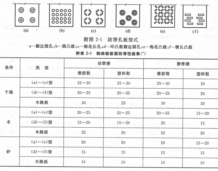 第2.0.3條按制作、防滑性能(見附錄二)及承載能力等條件,采用翻邊圓孔的鋼跳板,其型式為TB-1A、TB-1B、TB-2A和TB-2B等四種規格,板型如附錄三所示。