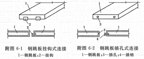 第4.0.3條鋼跳板要滿鋪、鋪平、鋪穩,從腳手架一端逐塊按順序鋪設,腳手架兩端的鋼跳板必須與腳手架小橫桿固定。平道和斜道上的鋼跳板,如果采用掛鉤式或插孔式(如附錄六所示)的鋼跳板,每間隔一塊要與腳手架小橫桿固定,即采用彎鉤式連接件(如附錄六所示)或采用其他型式連接件;如采用U型卡連接件的鋼跳板((如附錄六所示),每間隔15m左右與腳手架小橫桿固定。鋼跳板鋪設完畢,經檢查合格方可使用。