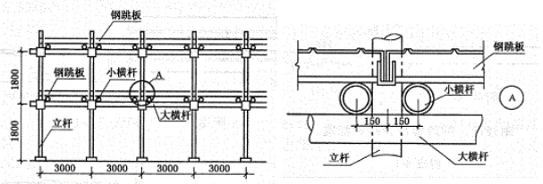 第4.0.2條鋼跳板的鋼管小橫桿(2m小橫桿)的最大間距為1.5m,鋼跳板接頭處必須安裝兩根小橫桿,其相互距離應不大于0.3m,鋼跳板端部懸出部分應不大于0.15m(如附錄五所示)。當未全部固定前,嚴禁鋪設鋼跳板。
