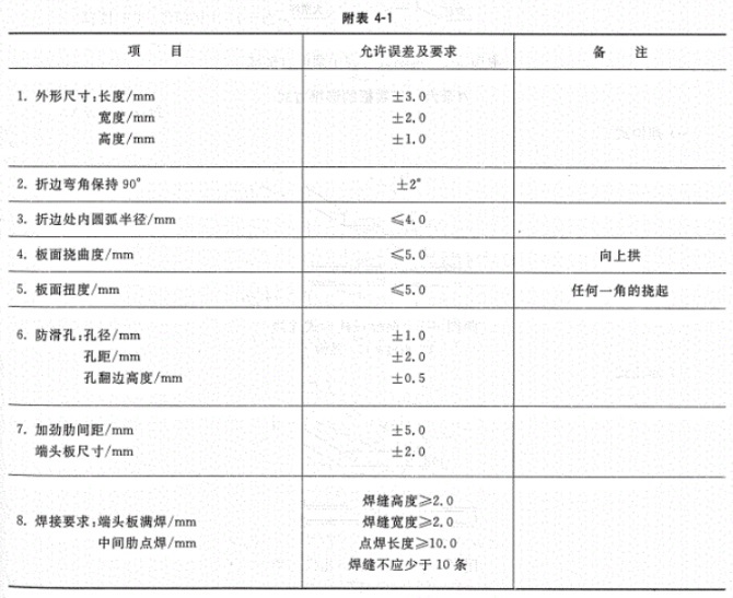 第3.0.2條板面防滑孔直徑誤差不宜超過士1.0mm,圓孔間距誤差不宜超過士2.0mm,孔翻邊 高度誤差不宜超過士0.5mm。