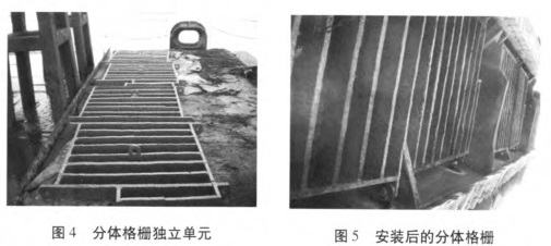 密集格柵的拆換需要?dú)飧钐幚恚臅r(shí)較長(zhǎng),若密集格柵的頻繁拆裝,將嚴(yán)重浪費(fèi)施工時(shí)間。所以密集型格柵多采用活動(dòng)格柵,即整個(gè)密集格柵由4塊獨(dú)立單元組成,在每個(gè)單元四角鉆孔,用于固定,然后再在耙頭內(nèi)側(cè)對(duì)應(yīng)的位置焊好帶孔的基座,最后將4塊格柵分別用螺栓與對(duì)應(yīng)的基座固定(圖4、5)。采用活動(dòng)的密集格柵,拆裝時(shí)間將大大縮短。