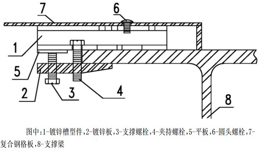 復合鋼格板連接裝置主要由復合鋼格板、支撐梁、鍍鋅槽型件、鍍鋅板和螺栓組成;將鍍鋅槽型件通過螺栓先固定在支撐梁上、而后安裝就位復合鋼格板,再用圓頭螺栓將復合鋼格板與槽型件連接固定,代替了現有技術中采用焊接連接方式不可拆卸且破壞鋼格板鍍鋅涂層的做法,從而優化了連接節點構造,同時最大限度減小了板縫以滿足樓板封閉的需求,降低了現場施工的難度。