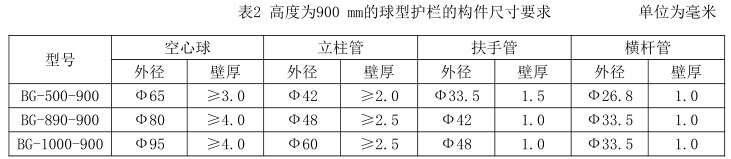 高度為900mm的球型護欄的構件尺寸要求如表2所示: