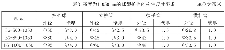 高度為1050mm的球型護欄的構件尺寸要求如表3所示: