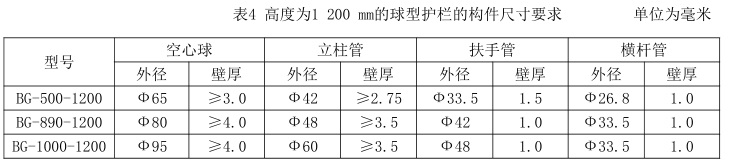 高度為1200mm的球型護欄的構件尺寸要求如表4所示: