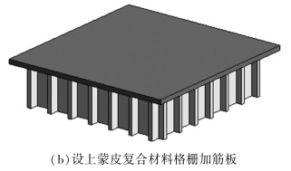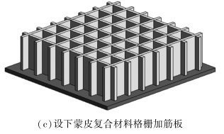 格柵板整體結構由格肋網格和蒙皮組成。在幾何形式上,格柵板結構具有較好的拓撲優化性,等重前提下相較于其他結構形式具有更大的截面慣性矩和更好的受彎性能,格肋也具有較高的法向剛度,可獲取更高的結構效率。此外,格肋相對獨立,在沖擊荷載作用下,受損后裂紋不易擴散,整體性能較好。