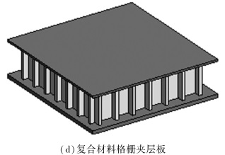 其中:格柵加筋板通過上或下蒙皮與格肋網格共固連接,以單面蒙皮約束格肋的失穩和變形,相較于純格柵板可更為有效地提高結構的整體剛度;格柵夾層板中上下蒙皮為主要受荷構件,而格肋主要為上下蒙皮提供有效的支撐與連接,通過格肋傳遞剪切應力,可使上下蒙皮變形一致,提高構件整體剛度。