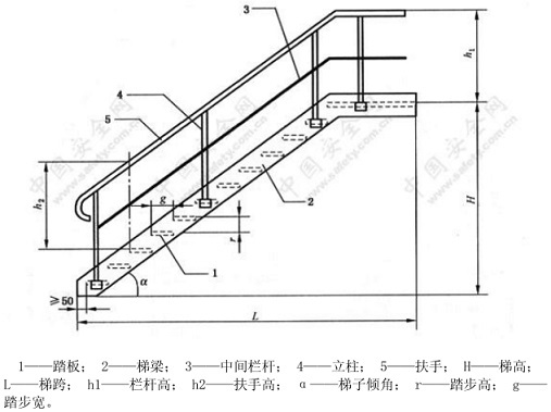 1、固定式鋼斜梯;永久性安裝在建筑物或設(shè)備上,與水平面成30°~75°傾角的踏板鋼梯(見圖1)。
