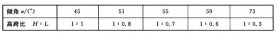 固定式鋼斜梯與水平面的傾角應(yīng)在30°~75°范圍內(nèi),優(yōu)選傾角為30°~35°。偶爾性進(jìn)入的最大傾角宜為42°。經(jīng)常性雙向通行的最大傾角宜為38°。在同一梯段內(nèi),踏步高與踏步寬的組合應(yīng)保持一致。常用的鋼斜梯傾角與對應(yīng)的踏步高r、踏步寬g組合(g+2r=600)示例見表1,其他傾角可按線性插值法確定。常用鋼斜梯傾角和高跨比(H:L)示例見表2。