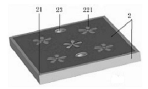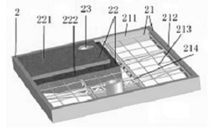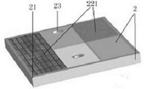 圖中,1-井座,11-井座托底角鐵;2-井蓋,21-井蓋內框體,22-井蓋澆注體,23-吊裝孔,211-側面板,212-上口水平包面板,213-平層筋,214-立向加強筋,221-仿石景觀面層,222-鋼纖維砼層。