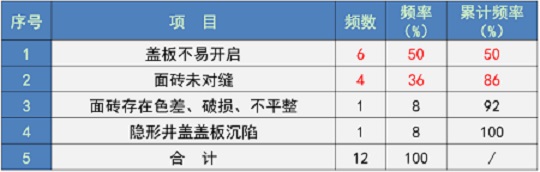 按隱形井蓋原設(shè)計(jì)要求,通過(guò)三個(gè)施工項(xiàng)目部按照不同種類面磚,分別加工制作和安裝施工共計(jì)32個(gè)隱形井蓋,并進(jìn)行跟蹤檢查,發(fā)現(xiàn)12個(gè)存在質(zhì)量問(wèn)題及不滿足精細(xì)化景觀要求,隱形井蓋驗(yàn)收合格率為62%,不合格率為38%,分析結(jié)果如下: