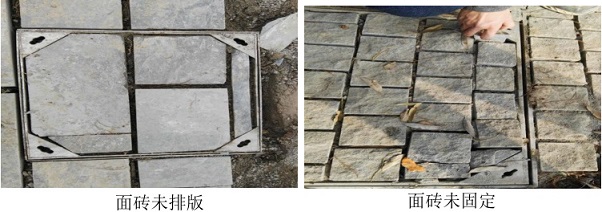 5、原設(shè)計(jì)面磚與隱形井蓋之間無(wú)砂漿結(jié)合,面磚之間無(wú)砂漿填縫,結(jié)合不緊密,易松動(dòng)。