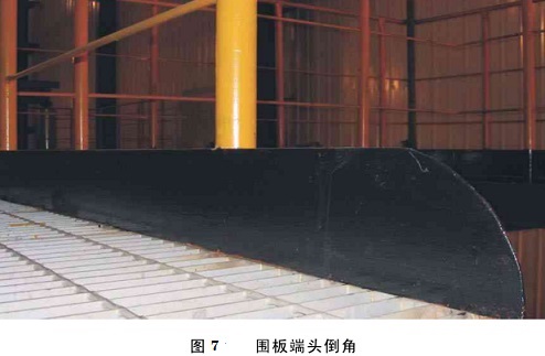 圍板安裝應在立柱、欄桿、鋼筋安裝完畢后進行。每一條圍板安裝時都應從一端或中間開始,以避免從兩端開始到中間而產生的“鼓肚”現象。圍板拐角應煨制,禁止焊制拐角。圍板對接處和圍板與鋼結構連接處焊接應牢固,外觀工藝美觀。每層圍板端頭倒角應一致,如圖7所示。