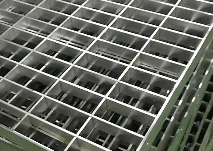 整體型插接鋼格板整體型插接鋼格板的承載扁鋼和橫桿扁鋼具有相同高度切槽深度為承載扁鋼的1/2。這種格柵板的經緯向格柵條一般是同一規格的扁鋼。其產品區別主要是橫向和縱向的格柵條的間距,已聯系格柵條的寬度和高度的變化。橫向柵條嵌入承重柵板然后用壓力焊機進行各節點的焊接。由于它與上一種格柵板結構相似,但橫向柵條為板條,其斷面系數大于扭絞方鋼,所以它具有比前一種格柵板更高的承載能力。由于橫向和縱向的格柵條共同承擔荷載,因而它具有單位重量承載力高的優點。此外它還具備易于生產、造價低廉、形式整齊劃一等優點。