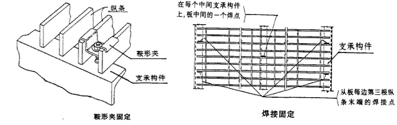 鋼格板與支承構件的連接,應根據使用要求、支承構件的側向穩定性以及經濟上進行綜合考慮。可采用焊接固定或鞍形夾固定,當鋼格板不要求可拆卸時,宜采用焊接固定。焊接點在每塊板兩端支承構件上不得少于二處,每根中間支承構件上不得少于一處,焊縫長度不小于20mm。當采用鞍形夾固定時,固定點同焊接固定點的要求。