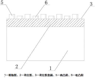 花紋板表面具有兩種規格的凸起結構,兩種規格的凸起結構的頂部分別距離花紋板表面的高度是不同的,根據高度的不同,兩種規格的凸起結構一種被稱為高凸起,另一種被稱為低凸起,兩種規格的凸起結構在花紋板表面均勻交錯設置,高凸起距離花紋板表面的高度為低凸起距離花紋板表面的高度的1.2-1.5倍,這樣的一個高度差,不至于使人體的腳底踩上去而感覺到不舒適;