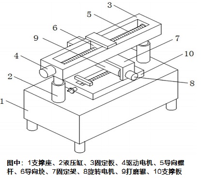 固定板的左側外壁通過螺栓固定有驅動電機,導向螺桿通過聯軸器與驅動電機的輸出軸固定連接,導向塊的表面焊接固定有限位板。固定架的一側外壁通過螺栓固定有旋轉電機,固定架內也通過焊接的軸承轉動連接有打磨輥,打磨輥也通過聯軸器與旋轉電機的輸出軸固定連接。