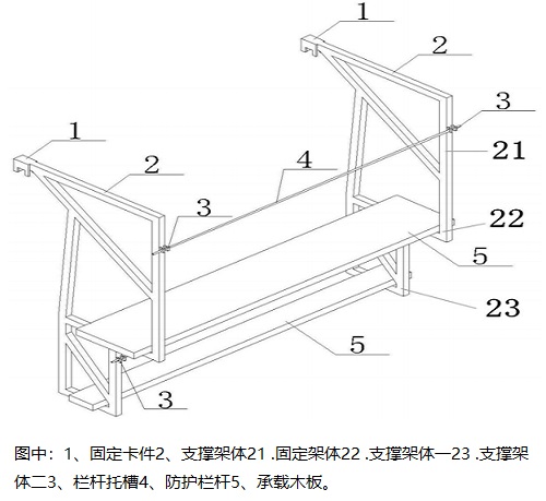 實(shí)用新型格柵板安裝拼裝操作平臺(tái)有效解決傳統(tǒng)鋼結(jié)構(gòu)棧道格柵板安裝需要搭設(shè)鋼管操作架,施工進(jìn)度慢的技術(shù)問(wèn)題,通過(guò)固定卡件將支撐架體卡固在在鋼結(jié)構(gòu)棧道平臺(tái),同時(shí),支撐架體遠(yuǎn)離棧道平臺(tái)一側(cè)設(shè)有防護(hù)欄桿,對(duì)坐在承載木板上的作業(yè)者提供了安全防護(hù),達(dá)到作業(yè)者施工條件。由于支撐架體與棧道平臺(tái)活動(dòng)連接,可以通過(guò)快速移動(dòng)支撐架體來(lái)滿足現(xiàn)場(chǎng)鋼結(jié)構(gòu)格柵板的快速安裝需求,結(jié)構(gòu)簡(jiǎn)單,使用方便,靈活性高,既減少了人員、材料的消耗,又滿足鋼結(jié)構(gòu)棧道在復(fù)雜多變地區(qū)的靈活機(jī)動(dòng)施工要求,同時(shí)也避免了對(duì)原有生態(tài)景觀的破壞,達(dá)到了綠色施工的效果,節(jié)省了工程成本。