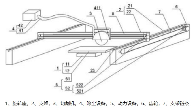 玻璃鋼格柵的切割裝置,包括:旋轉座,旋轉座包括固定底座和旋轉托座;支架,支架包括固定支架和移動支架,位移支架可位移安裝在固定支架上;切割機,切割機可滑移安裝在移動支架上;除塵設備,除塵設備包括除塵軟管和除塵風機;以及動力設備,動力設備包括旋轉電機和正反電機。