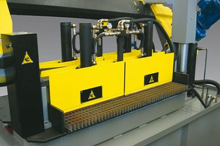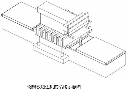鋼格板是用承載扁鋼(橫板)和縱桿按照一定的間距進行正交組合,通過焊接或壓鎖加以固定的開敞式鋼構件,而鋼格板在生產過程中會產生毛邊或余邊,需要使用切邊機對鋼格板的兩側進行邊切除,從而使得鋼格板的寬度統一且兩邊平整。現有的切邊機對鋼格板的定位固定多采用直接壓緊,且需要人工手動操作,切割位置不夠精確,切割后仍需打磨,耗時耗力,效率低下。現介紹一款新型鋼格板切邊機,具有自動化程度高、切割精準高、節省人力、生產效率高,具有非常高的效益。
