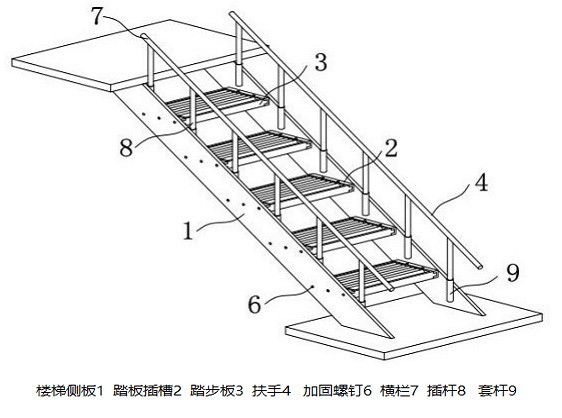 組合式鋼格板樓梯主要適用于各種工地、工廠等臨時(shí)的搭建多層鋼板房使用,在不使用時(shí),只需要拆開本裝置的各種組件,能夠方便運(yùn)輸和儲(chǔ)存,等要組裝時(shí),需要兩人配合,將一個(gè)樓梯側(cè)板平放于地面,柵格踏步板依次插入踏板插槽中,再將另一個(gè)樓梯側(cè)板的踏板插槽與柵格踏步板配合固定,通過加固螺釘固定后再將扶手通過插桿插入套桿中,最后將組合后的本裝置豎立在地面和二層之間并固定。