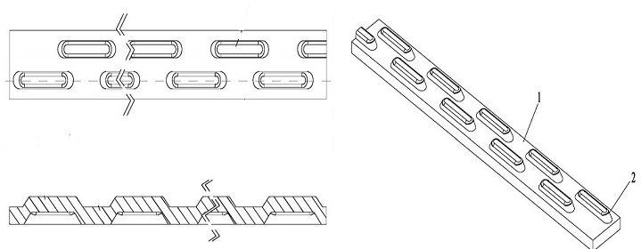 針對上述問題,提供一種鋼格板電阻焊包邊件,該包邊件生產制造快捷、方便,且工作過程中送進、送出作業時,不會有落差。鋼格板電阻焊包邊件,其特征在于:包括扁鋼本體,扁鋼本體上設有兩列凸臺,同列凸臺中相鄰兩個凸臺的間距小于凸臺的長度,每個凸臺的中心都和另一列凸臺中相鄰兩個凸臺間隔的中心對齊。凸臺規格統一,每個凸臺均朝向扁鋼本體同一側凸起,凸臺根部與扁鋼本體平面之間呈圓弧過渡連接。