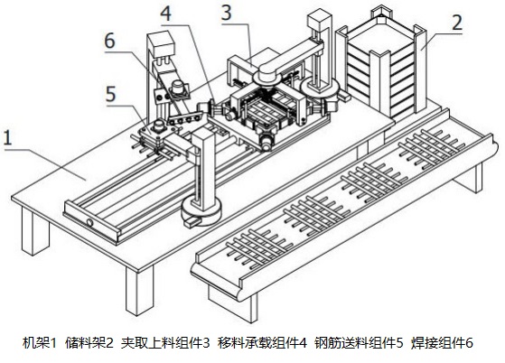 現介紹一種隱形井蓋鋼筋自動化焊接設備,包括:機架;儲料架;夾取上料組件;移料承載組件;鋼筋送料組件;焊接組件;夾取上料組件包括:第一轉臺,設置在機架靠近儲料架的一側;第一升降機構,豎直安裝在第一轉臺輸出端上;第一安裝支架,水平安裝在第一升降機構的輸出端上;夾取驅動機構,設置在第一安裝支架上;定位夾持機構,設置在夾取驅動機構的輸出端上,夾取驅動機構與定位夾持機構傳動連接。隱形井蓋鋼筋的自動化焊接設備,能自動化實現對隱形井蓋的鋼筋焊接操作,降低了人工強度,提高了工作效率,提高了焊接精度,能夠同時對鋼筋網的多個端部進行焊接。