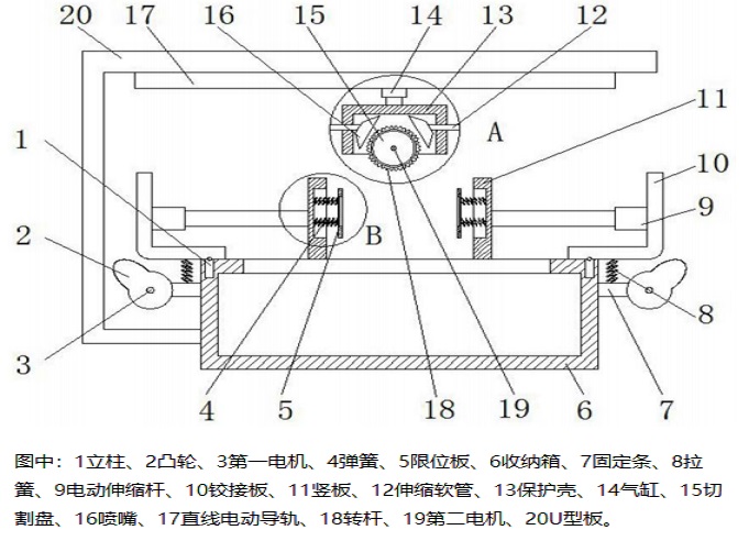 工作原理:首先,接通****電機、電動伸縮桿、氣缸、直線電動導軌和第二電機的電源,將鋼格板放在兩個限位板的卡槽內,啟動電動伸縮桿,帶動兩個豎板相互靠攏,實現限位和固定目的,滿足不同尺寸鋼格板的夾持,避免鋼格板移位,****開口質量,之后,根據客戶的需求,拆卸螺栓,更換不同類型的異形鋸齒模具,可以制作不同形狀的鋼格板,提高了工作效率,然后,啟動氣缸,帶動保護殼下移,直至切割盤靠近鋼格板為止,再啟動直線電動導軌,帶動切割盤左右移動,便于切割時移動,實現不同位置的切割,也可以對切割成不同深度的開口,提高了開口效率,然后,啟動第二電機,在切割盤和異異形鋸齒模具的配合下,對鋼格板進行開口切割,同時,將伸縮軟管與供氣設備連接,通過伸縮軟管和噴嘴的配合,對發熱的切割盤進行冷氣降溫,延長切割盤的壽命,切割完成后,啟動****電機,帶動凸輪轉動,在立柱的作用下,改變L型鉸接板的位置,通過設置電動伸縮桿,將鋼格板推送到收納箱內的抽屜中,便于人工取走,最后,抽出抽屜,完成鋼格板的收集。
