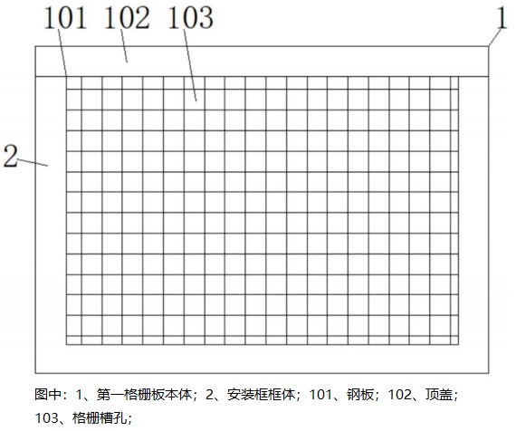 頂蓋上的定位柱安裝在安裝框框體上的定位孔內,定位柱的外壁與定位孔的孔壁間隙連接。****強力磁鐵與第二強力磁鐵磁性連接。****格柵板本體上的格柵槽孔與第二格柵板本體上的格柵槽孔之間相互錯位分布。