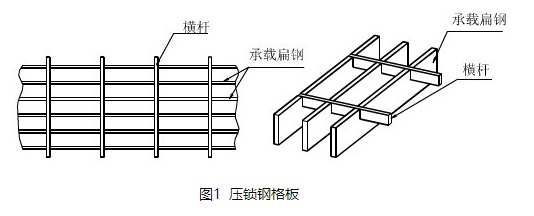 壓鎖鋼格板的橫桿通常采用扁鋼,其加工時(shí)在承載扁鋼和橫桿的每個(gè)交點(diǎn)處通過(guò)壓力將橫桿壓入承載扁鋼或預(yù)先開(kāi)好槽的承載扁鋼中,將其固定。通過(guò)該種方式加工壓鎖式鋼格板,需要加工設(shè)備具有足夠的壓力,配合復(fù)雜的工裝,才能將橫桿順利壓入承載扁鋼;即使在承載扁鋼上預(yù)先開(kāi)好槽,為了使橫桿與承載扁鋼固定,承載扁鋼上開(kāi)的槽的尺寸與橫桿的厚度必須采取過(guò)盈配合,也必須要很大的壓力,而且對(duì)橫桿的厚度公差要求很高,普通的扁鋼很難適用。