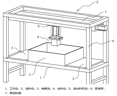 通過抓取組件將鋼格板,通過移動板的移動將鋼格板放入電解池中,在鋼格板在電解池中電解拋光后,再通過抓取組件將電解池中的鋼格板取出,實現自動電解拋光,減小工人的操作,在拋光后自動取出,提高拋光效率,進一步提高電解拋光的安全性。