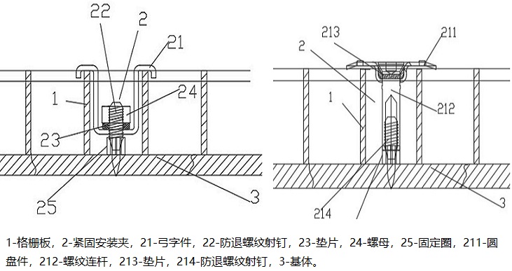 緊固安裝夾包括圓盤件、螺紋連桿、墊片、防退螺紋射釘和固定圈;圓盤件的兩端分別搭設在鋼格柵板的上端;在圓盤件的底端中部設置螺紋連桿,且螺紋連桿與圓盤件之間設置墊片;在螺紋連桿的底端套設有 防退螺紋射釘,且防退螺紋射釘的底端固定在基體上;固定圈套設在防退螺紋射釘的底端。