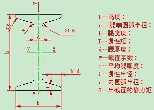 普通工字鋼和輕型工字鋼的型號是用其腰高厘米數的阿拉伯數字來表示,腹板、翼緣厚度緣寬度不同其規格以腰高( h)×腿寬(b)×腰厚(d)的毫數表示,如“普工160×88×6”,即表示腰高為160毫米,腿寬為88毫米,腰厚為6毫米的普通工字鋼